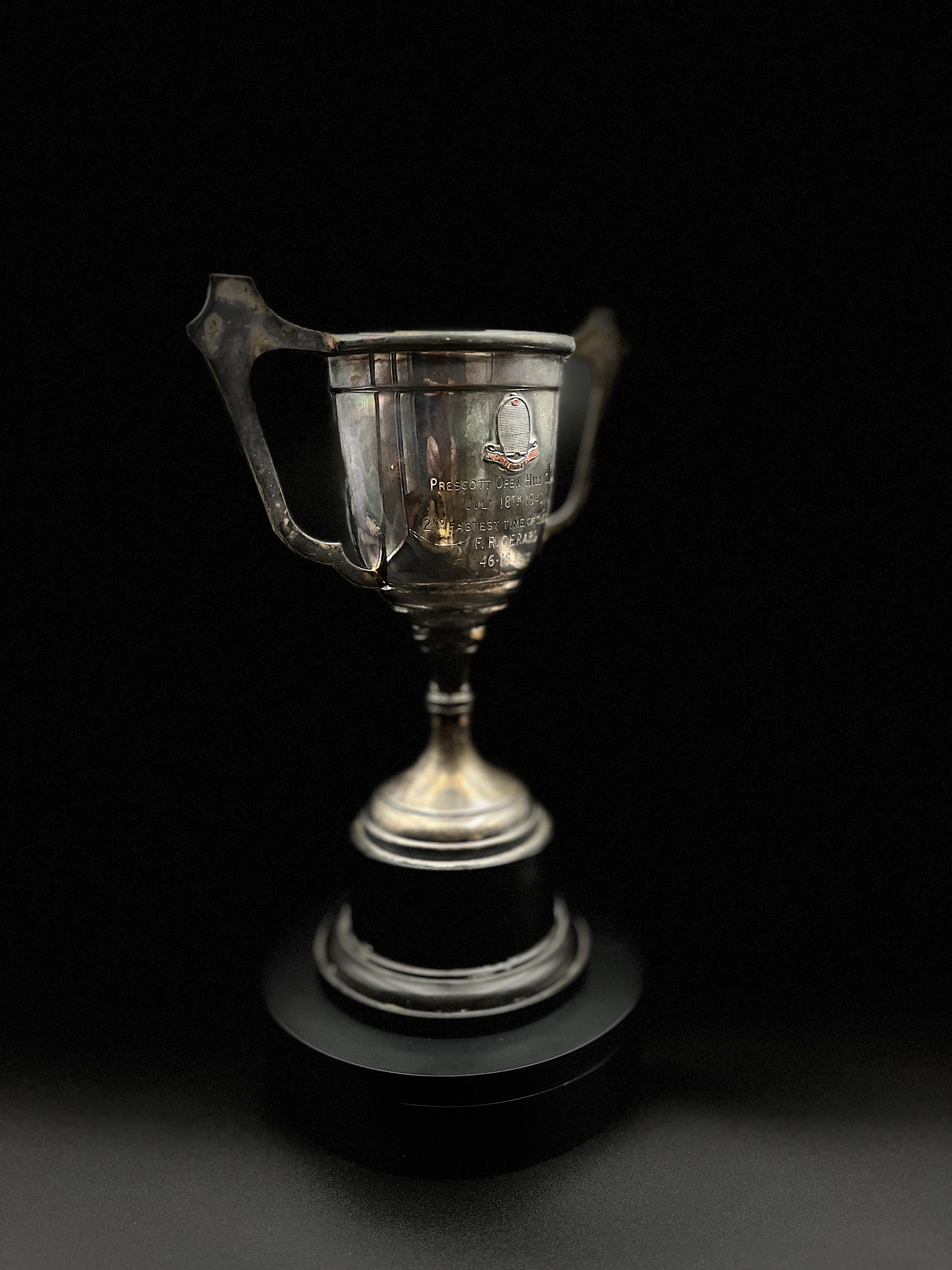 A small twin handled trophy, with hallmark, presented to Bob Gerard, in recognition of setting the second fastest time of the day at the Prescott Open Hill Climb on 18 July 1948, in a time of 46.18 seconds.