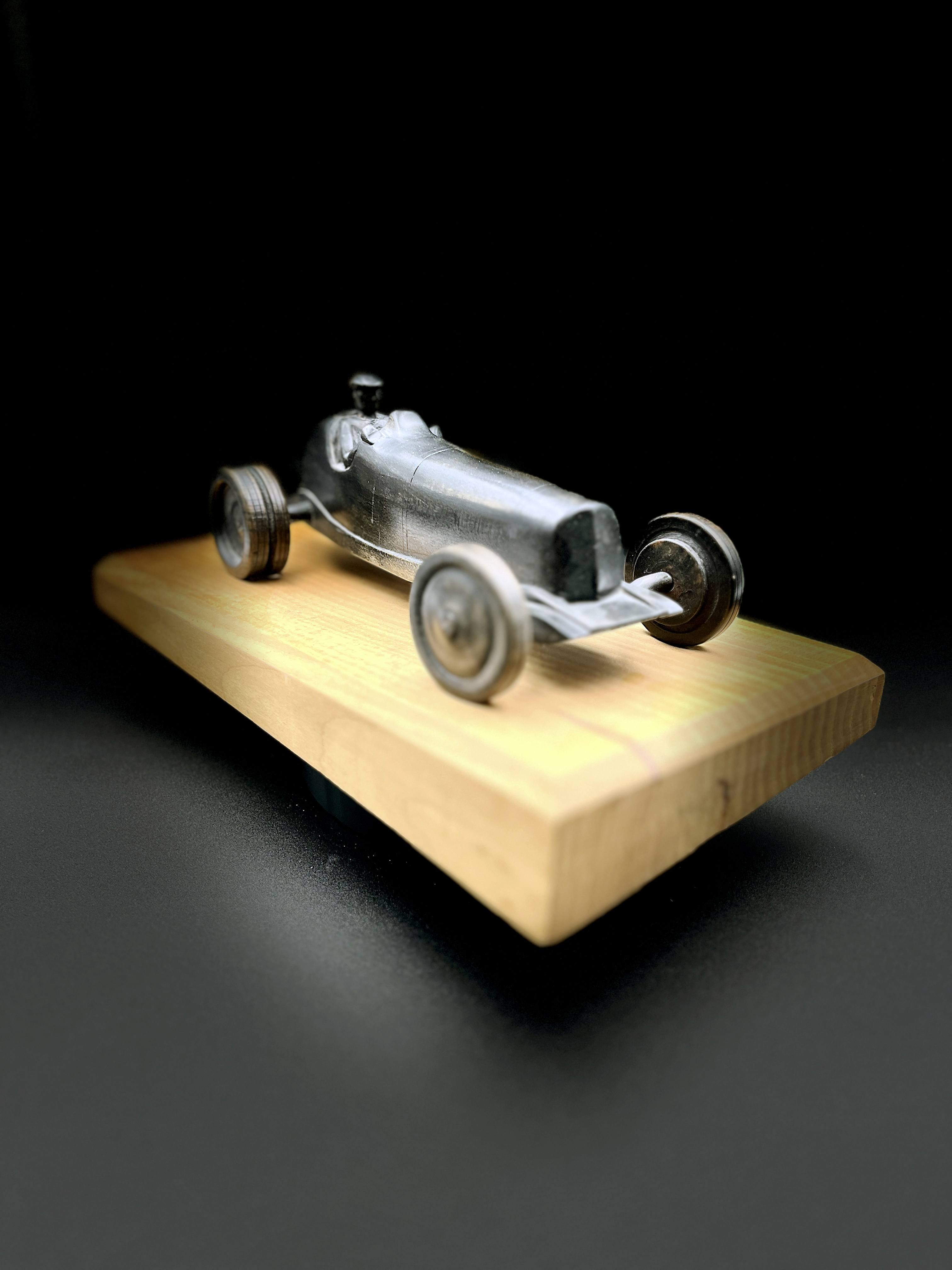 A beautiful hand crafted solid wood model, measuring approximately 9.5” x 5” and loosely based on the ERA six wheel special, as driven by Raymond Mays when he recaptured the Shelsley Walsh Hill Climb record in 1935.