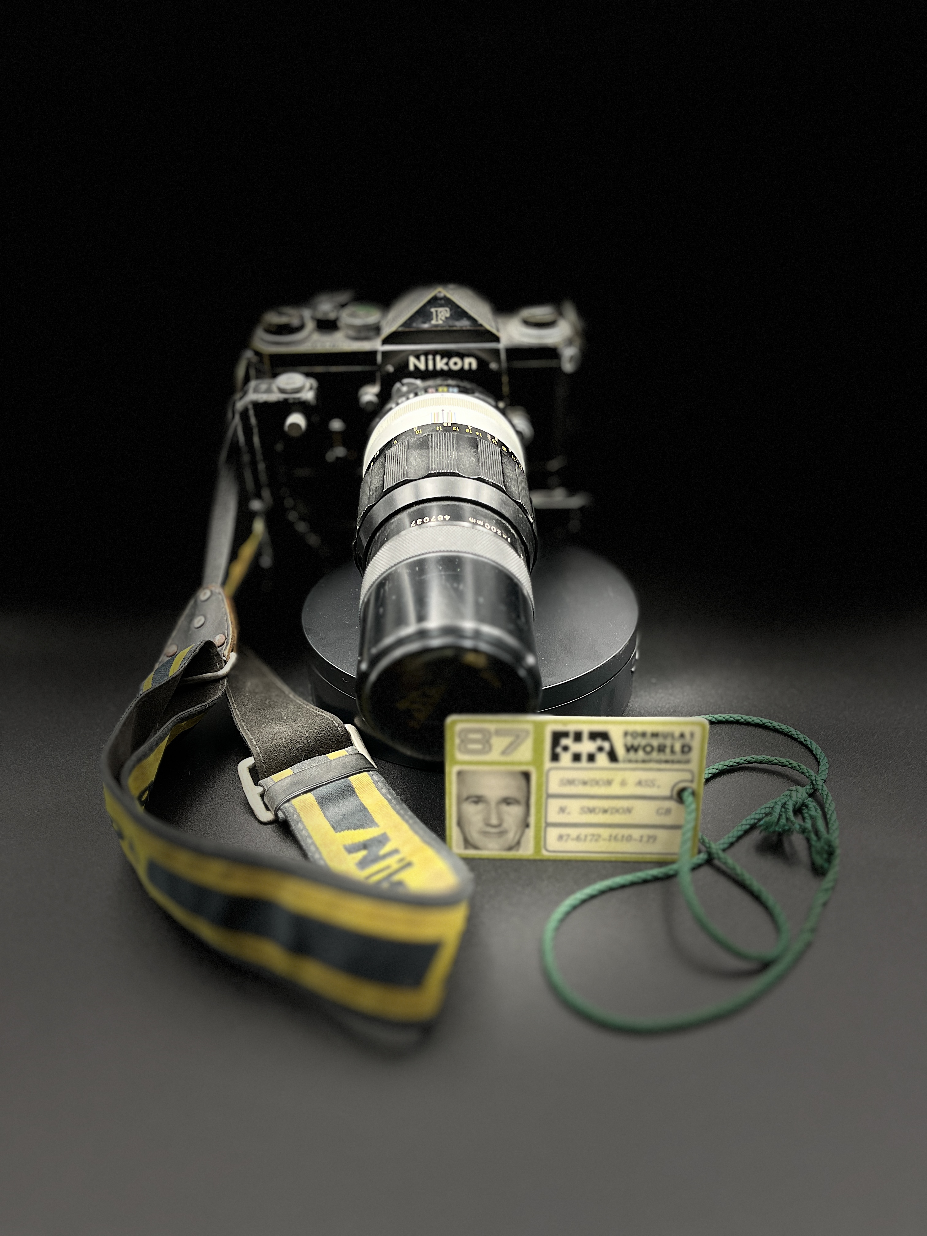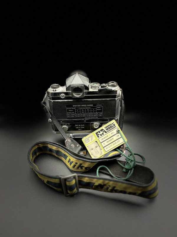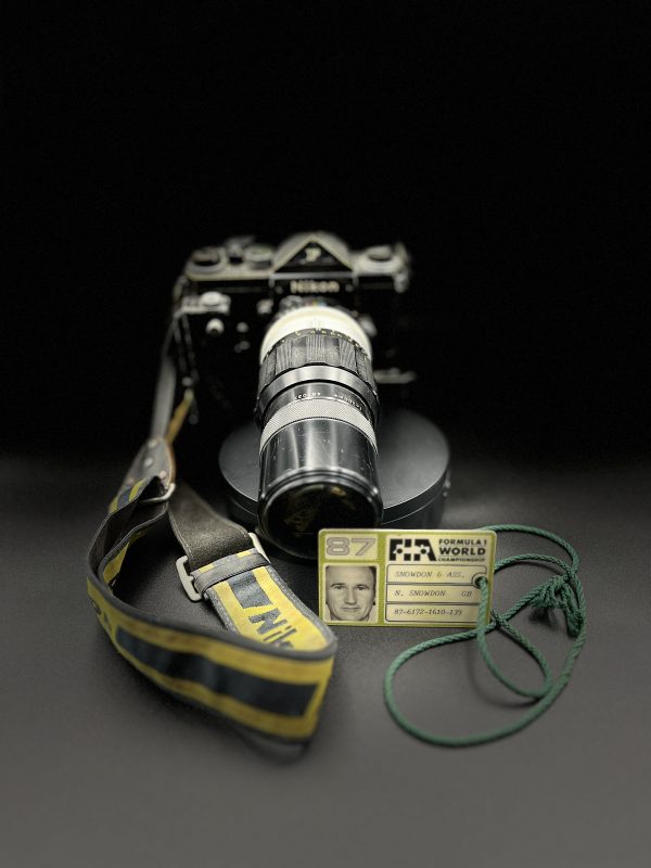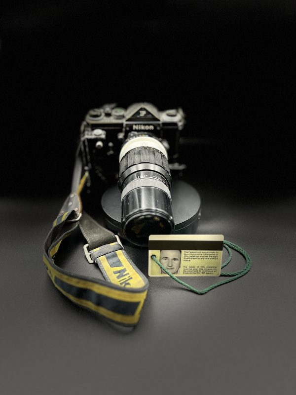 An amazing ‘time-warp’ Nikon camera, complete with 200mm telephoto lens, motor drive, Nikon strap and original Press Pass for Nigel Snowdon. This pass is dated 1987 when Nigel was an established FIA accredited photographer.