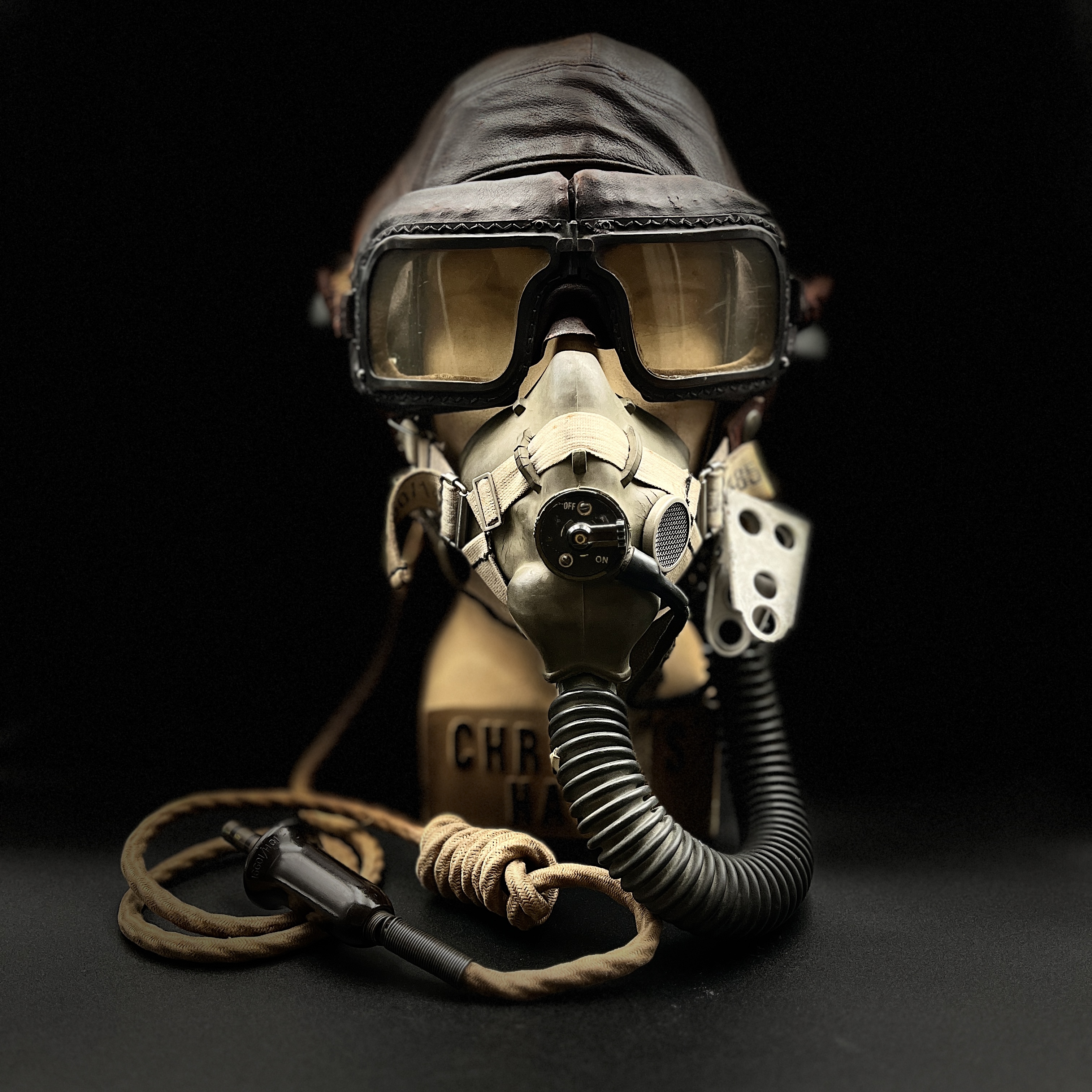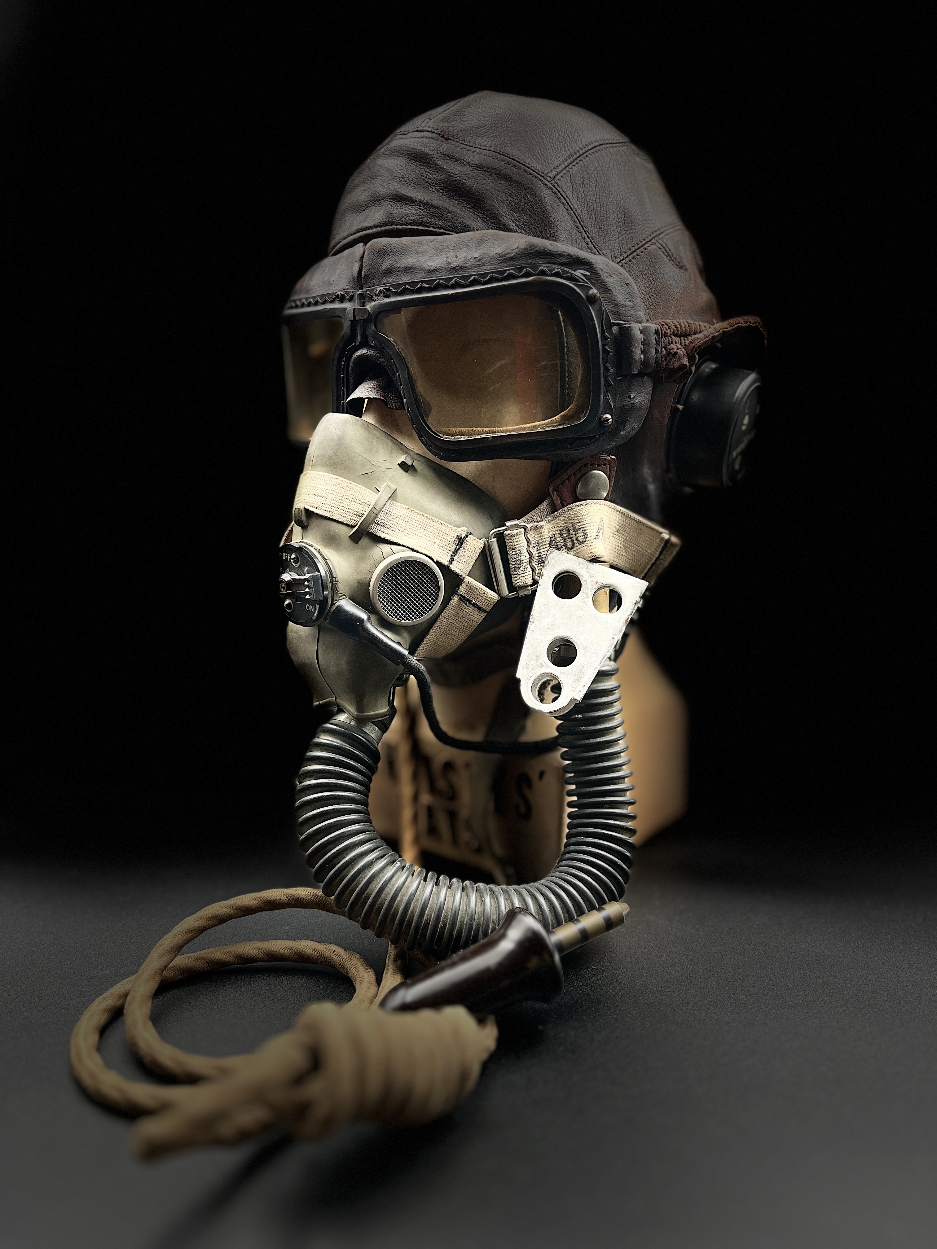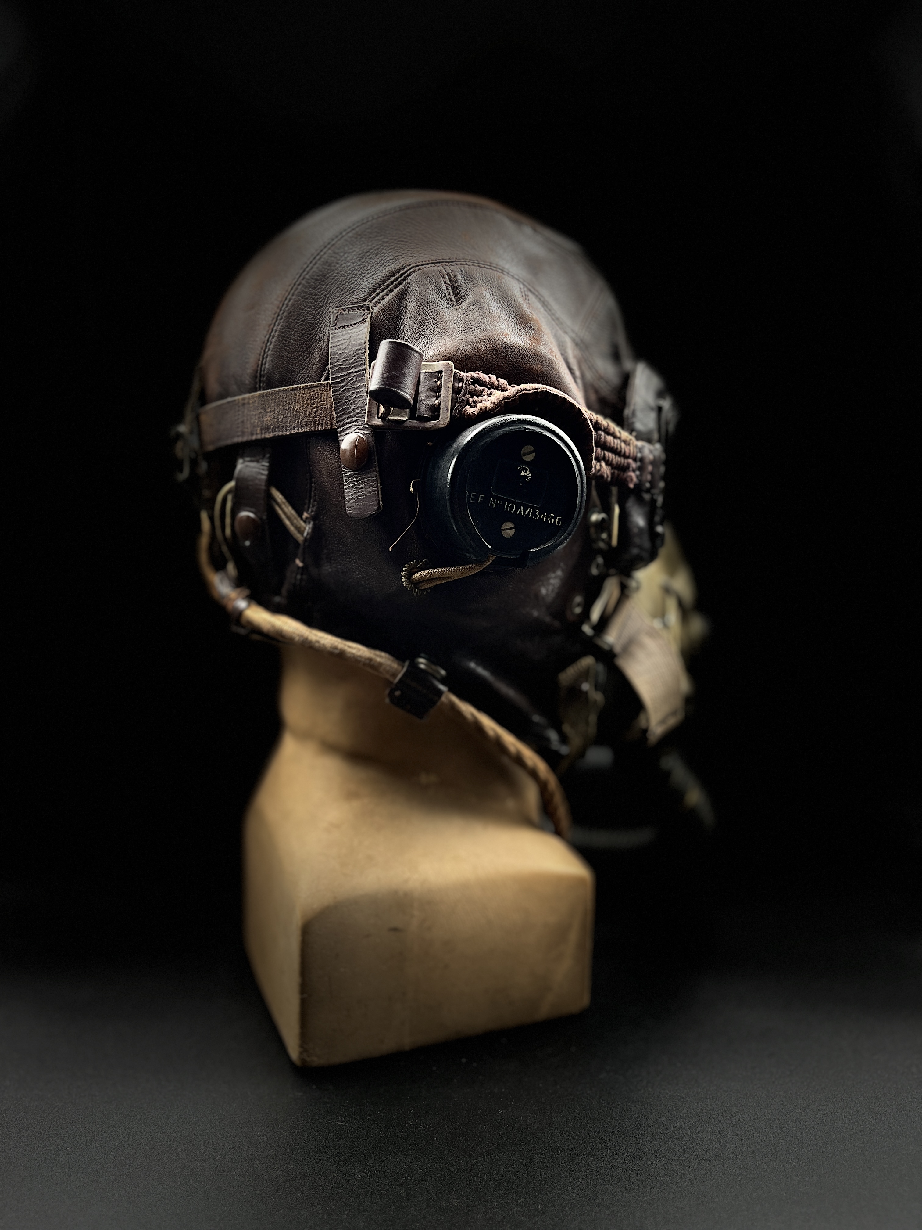 This World War 11 C type helmet was issued by the Air Ministry in 1942. It consists of a brown leather C type flying helmet with chamois lining, radio telephone receivers marked 10A/13466, together with an H type oxygen mask including built in microphone and high altitude breathing tube having a Bakelite fitting. Completing this fantastic piece of memorabilia is a pair of R.A.F. Mk 111 goggles.